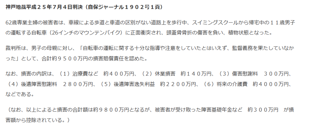 神戸地方裁判所の判決では、当時11歳の男子児童が自転車で坂道を下っていた際、歩行中の62歳の女性と正面衝突し、相手に重い後遺障害が残った事故で、母親に約9,500万円の損害賠償責任が認められました。